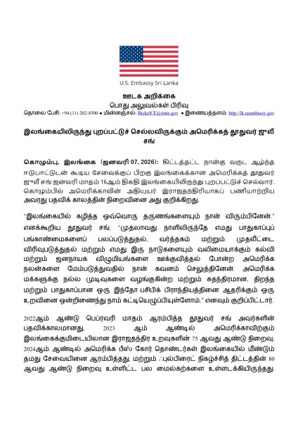 07/01/2026Sri Lanka Tamil Newsநான்கு ஆண்டு சேவைக்கு பின்னர் இலங்கையை விட்டு வெளியற தயாராகும் அமெரிக்க தூதர் ஜூலி சுங்!வாசிக்கநான்கு ஆண்டு சேவைக்கு பின்னர் இலங்கையை விட்டு வெளியற தயாராகும் அமெரிக்க தூதர் ஜூலி சுங்!