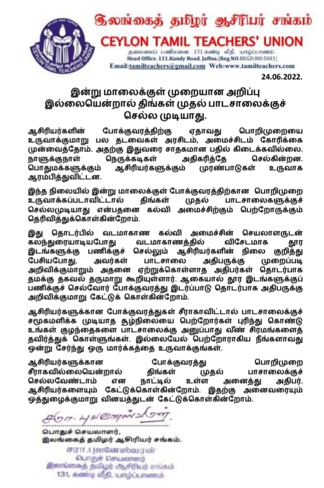 24/06/2022Sri Lanka Tamil Newsதிங்கள் முதல் பாடசாலைக்குச் செல்லமாட்டோம்-ஆசிரியர் சங்கம் திடீர் அறிவிப்பு!வாசிக்கதிங்கள் முதல் பாடசாலைக்குச் செல்லமாட்டோம்-ஆசிரியர் சங்கம் திடீர் அறிவிப்பு!