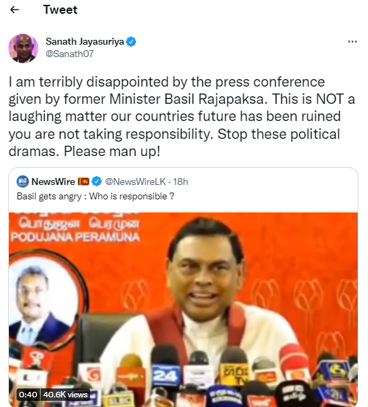 10/06/2022Sri Lanka Tamil News‘இது சிரிக்கும் விடயம் அல்ல: நாட்டின் எதிர்காலம் பாழாகிவிட்டது’- பசில் குறித்து சனத் ஜயசூர்யவாசிக்க‘இது சிரிக்கும் விடயம் அல்ல: நாட்டின் எதிர்காலம் பாழாகிவிட்டது’- பசில் குறித்து சனத் ஜயசூர்ய