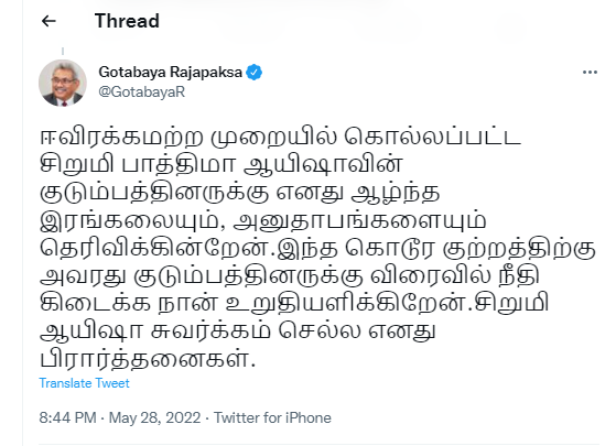 29/05/2022Sri Lanka Tamil Newsஅட்டுலுகம சிறுமி கொலை குற்றவாளிகளை கைது செய்ய நடவடிக்கை: ஜனாதிபதி உறுதிவாசிக்கஅட்டுலுகம சிறுமி கொலை குற்றவாளிகளை கைது செய்ய நடவடிக்கை: ஜனாதிபதி உறுதி