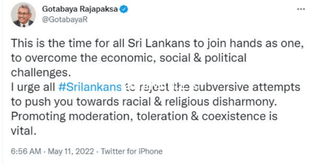 11/05/2022Sri Lanka Tamil Newsசவால்களை வெற்றிகொள்ள அனைத்து இலங்கையர்களும் ஒன்றாக கைகோர்க்க வேண்டிய தருணம் இது! கோட்டா ட்விட்வாசிக்கசவால்களை வெற்றிகொள்ள அனைத்து இலங்கையர்களும் ஒன்றாக கைகோர்க்க வேண்டிய தருணம் இது! கோட்டா ட்விட்