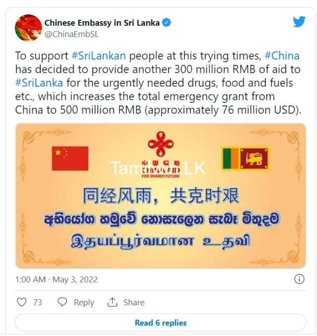 03/05/2022Sri Lanka Tamil Newsஇலங்கைக்கு மேலும் உதவிகளை வழங்குவதாக சீனா அறிவிப்புவாசிக்கஇலங்கைக்கு மேலும் உதவிகளை வழங்குவதாக சீனா அறிவிப்பு