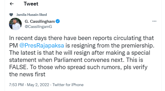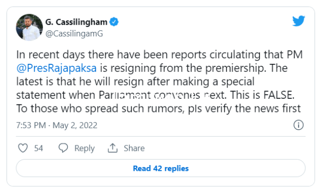 02/05/2022Sri Lanka Tamil Newsபிரதமர் பதவி விலக மாட்டார்: ஜி. காசிலிங்கம்வாசிக்கபிரதமர் பதவி விலக மாட்டார்: ஜி. காசிலிங்கம்