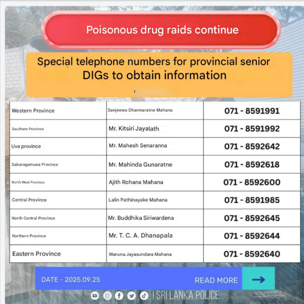 25/09/2025Sri Lanka Tamil Newsபோதைப்பொருள் தகவல்களை வழங்க விசேட இலக்கங்கள்!வாசிக்கபோதைப்பொருள் தகவல்களை வழங்க விசேட இலக்கங்கள்!