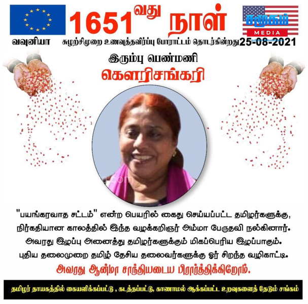25/08/2021Sri Lanka Tamil Newsகௌரிசங்கரியின் இழப்பு அதிர்ச்சியளிக்கின்றது- காணாமல் ஆக்கப்பட்டவர்களின் உறவுகள்வாசிக்ககௌரிசங்கரியின் இழப்பு அதிர்ச்சியளிக்கின்றது- காணாமல் ஆக்கப்பட்டவர்களின் உறவுகள்