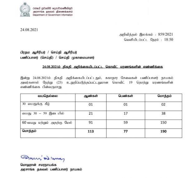 24/08/2021Sri Lanka Tamil Newsஇலங்கையில் கொரோனாவால் மேலும் 190 பேர் உயிரிழப்புவாசிக்கஇலங்கையில் கொரோனாவால் மேலும் 190 பேர் உயிரிழப்பு
