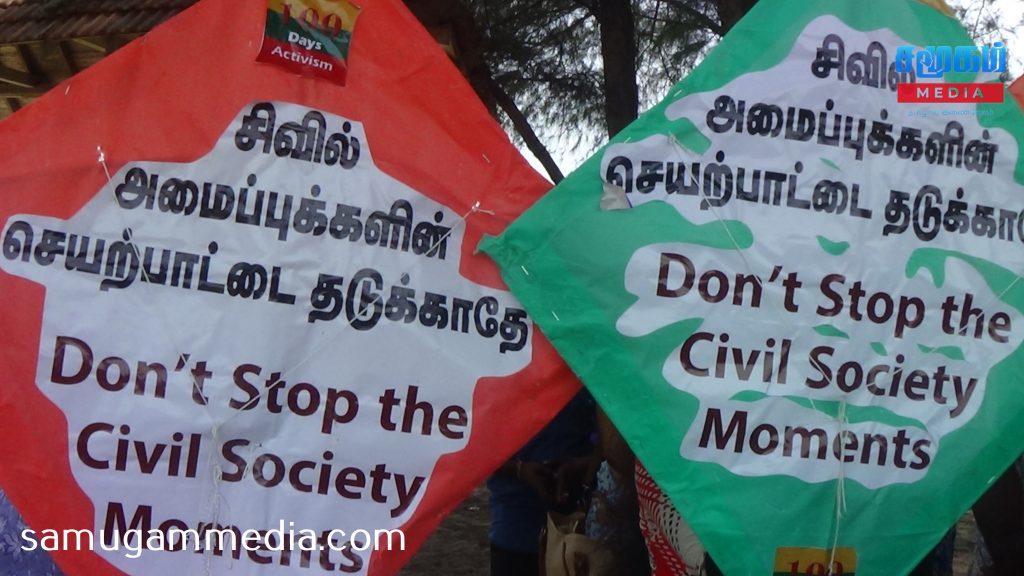 போராட்டத்தின் இறுதியில் கோரிக்கை வாசகங்கள் எழுதப்பட்ட காற்றாடிகள் பேரணியாக கடற்கரையில் எடுத்துச் செல்லப்பட்டு பறக்கவிடப்பட்டன.