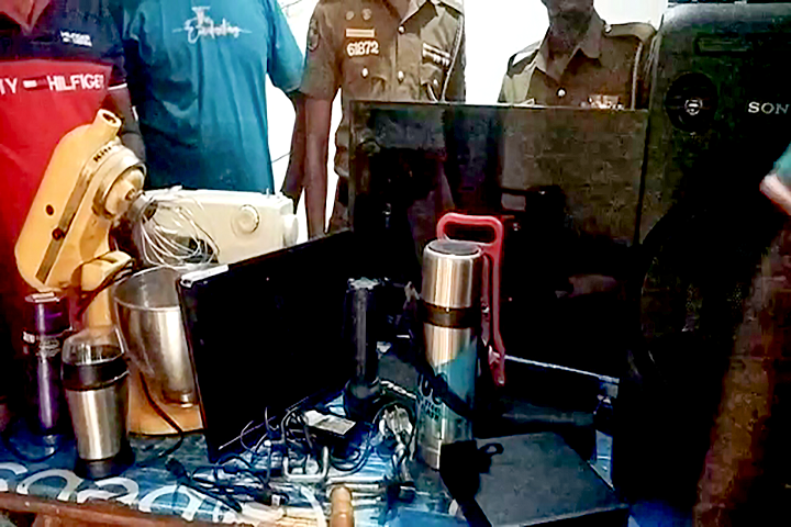 கைது செய்யப்பட்டவர்களிடம் இருந்து வெற்று எரிவாயு சிலிண்டர், எரிவாயு அடுப்பு , தொலைக்காட்சி பெட்டி , நீர் இறைக்கும் மின் மோட்டார் உள்ளிட்ட ஏழு இலட்ச ரூபாய் பெறுமதியான பொருட்கள் மீட்கப்பட்டுள்ளன.