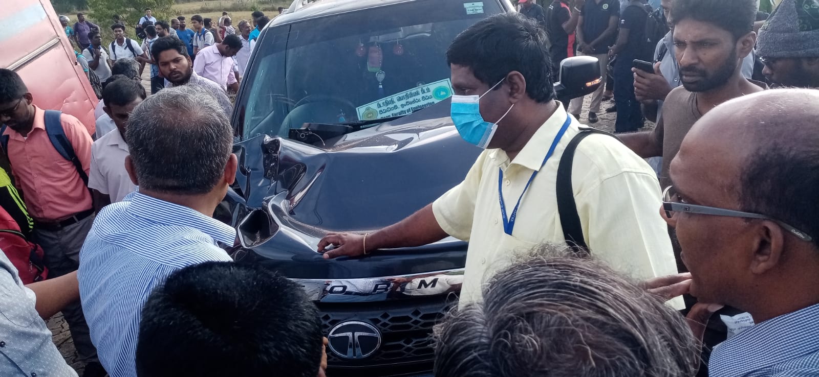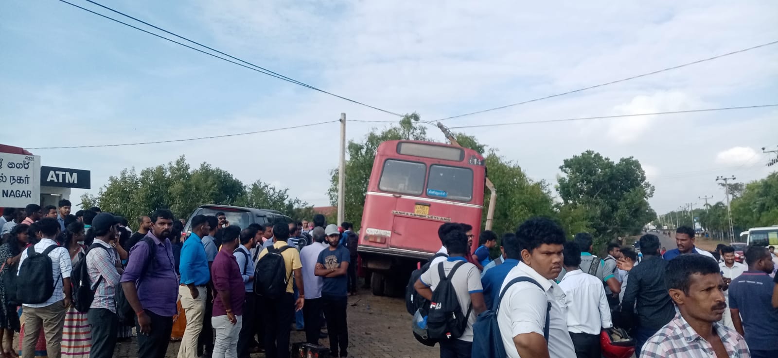யாழ்.பல்கலைக்கழகத்திற்கு ஊழியர்களை ஏற்றி பயணித்த அரச பேருந்து, புதையிரத கடவையை கடக்க முற்பட்டபோது, யாழ்ப்பாணத்திலிருந்து முறிகண்டி நோக்கி பயணித்த யாழ்.ராணி புகையிரதம் மோதியுள்ளது.