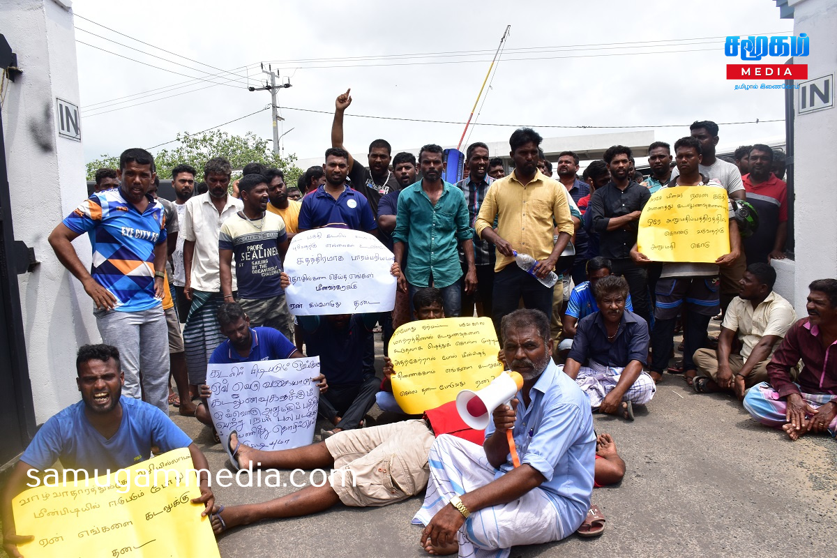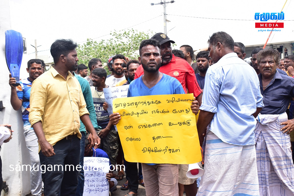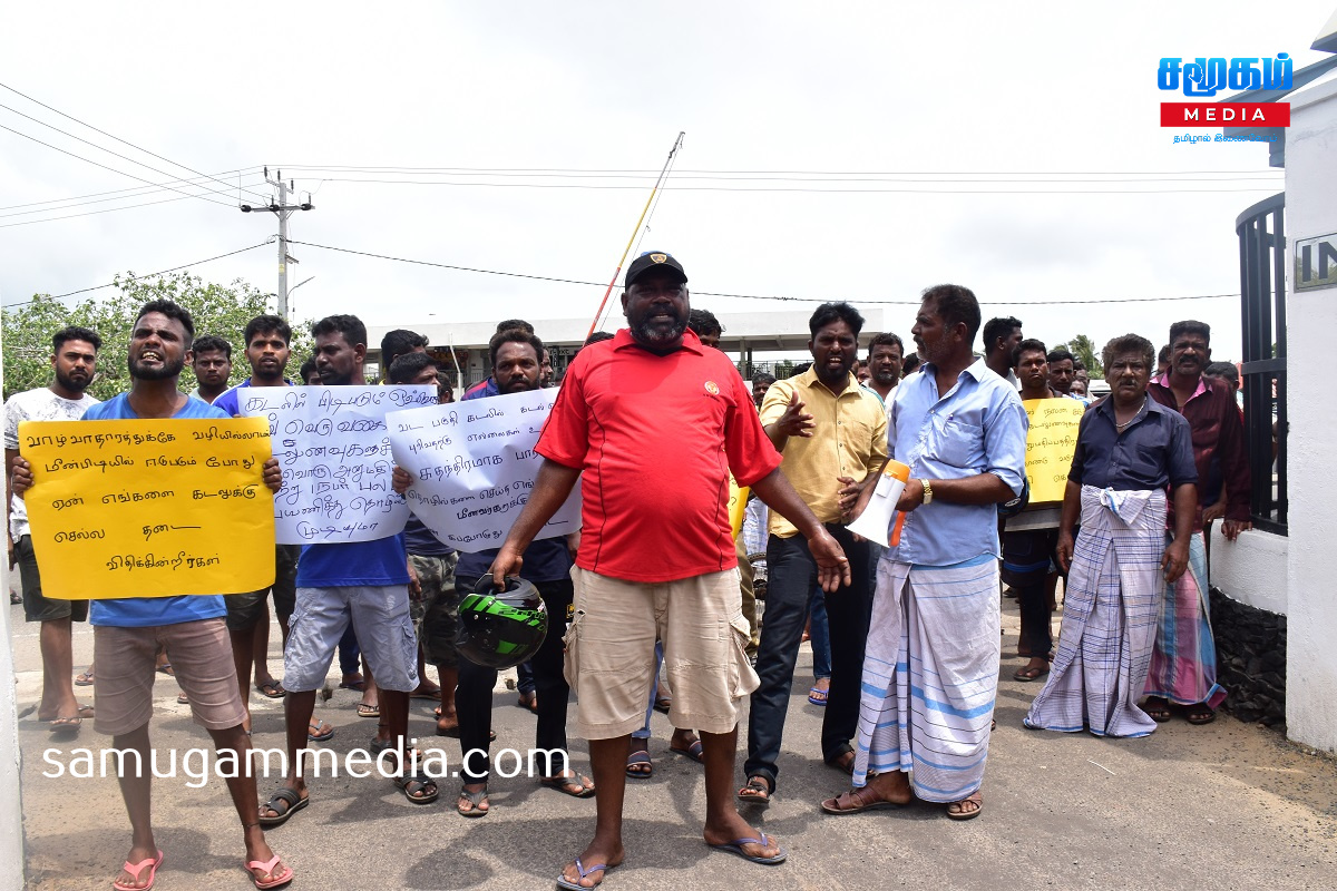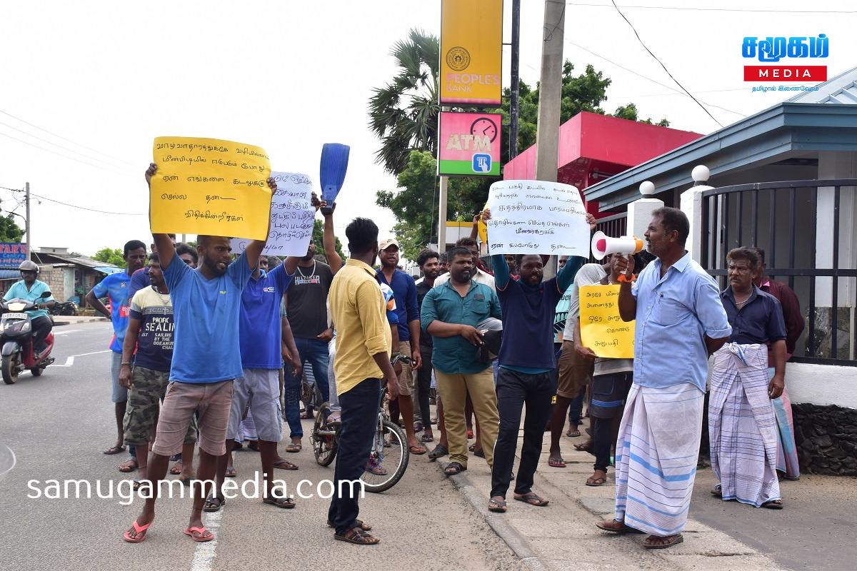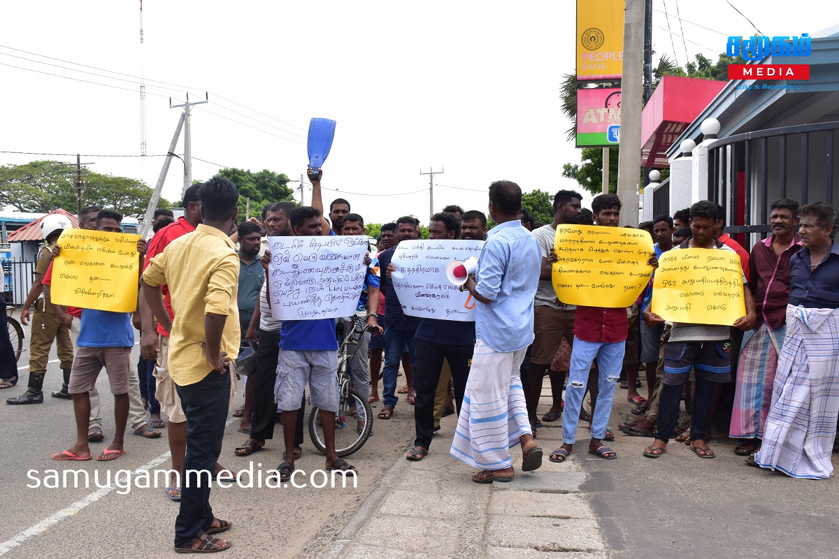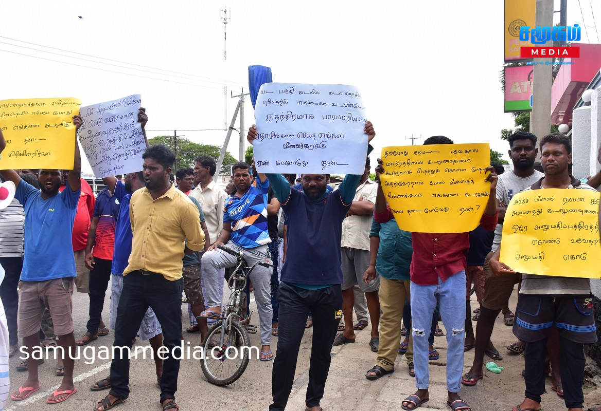 கடலில் பிடிபடும் ஒவ்வொரு வகையான கடல் உணவுகளுக்கும் ஒவ்வொரு அனுமதிப் பத்திரமா?,வாழ்வாதாரத்துக்கு வழியில்லாமல் மீன்பிடியில் ஈடுபடும் போது ஏன் எங்களை கடலுக்குள் செல்ல தடை விதிக்கின்றீர்கள்?,சுதந்திரமாக வடபகுதி கடலில் தொழில் செய்த எங்களுக்கு ஏன் இப்போது தடை ?,உள்ளிட்ட வாசகங்கள் எழுதப்பட்ட பதாகைகளை ஏந்தியவாறு போராட்டத்தில் ஈடுபட்டனர்.