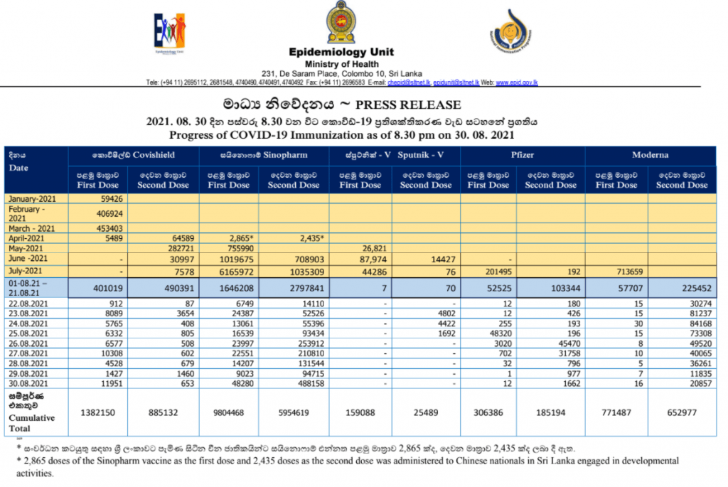 குறிப்பாக அதிகளவாக 48 ஆயிரத்து 280 பேருக்கு சினோபார்ம் தடுப்பூசியின் முதலாவது டோஸும் 4 இலட்சத்து 88 ஆயிரத்து 158 பேருக்கு சினோபார்ம் தடுப்பூசியின் இரண்டாவது டோஸும் செலுத்தப்பட்டன.