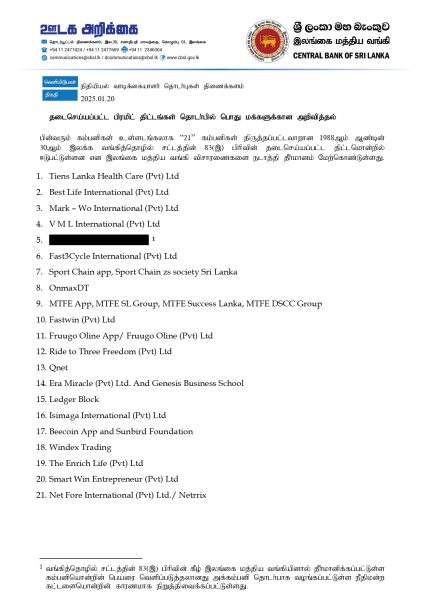 CBSL இன் அறிக்கையின்படி, 1988 ஆம் ஆண்டின் 30 ஆம் இலக்க வங்கிச் சட்டத்தின் பிரிவு 83 (இ) இன் கீழ், திருத்தப்பட்டபடி நிறுவனங்கள் தடைசெய்யப்பட்ட திட்டத்தில் ஈடுபட்டுள்ளன.