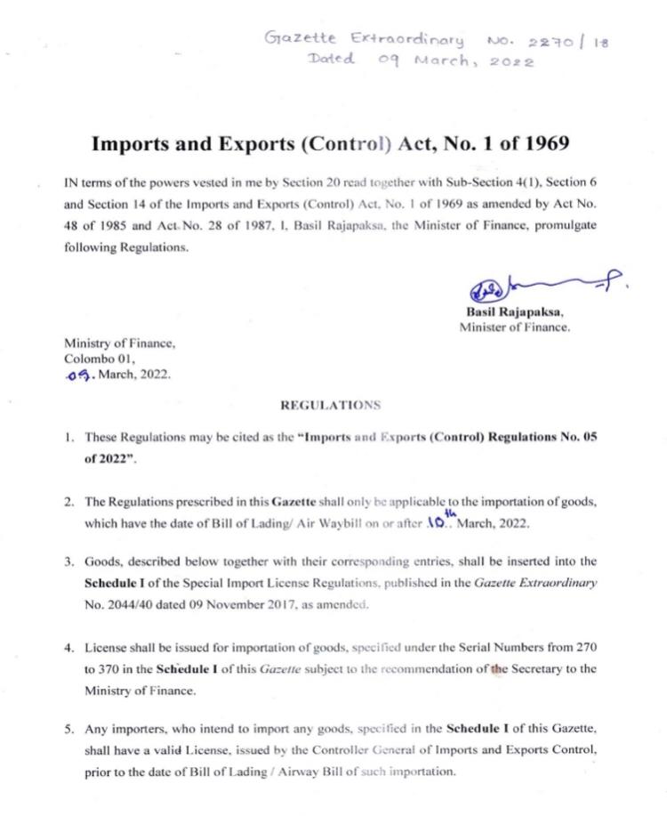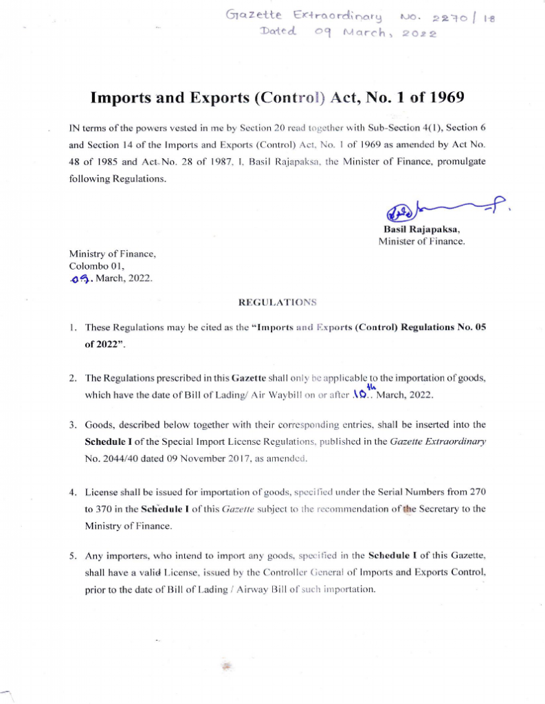 இதுகுறித்தான அறிவித்தலில் நிதியமைச்சர் பசில் ராஜபக்ச கையெழுத்திட்டுள்ளார்.