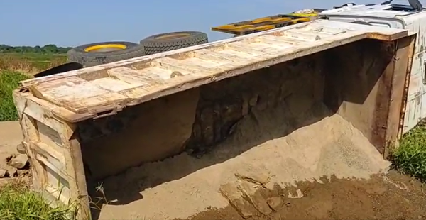 வாய்க்காலைக் கடக்க முற்பட்டபோது, பழைய பாலம் எடையைத் தாங்க முடியாமல் இடிந்து விழுந்ததால் டிப்பர் லொறி நிலைதடுமாறி குடைசாய்ந்துள்ளது.