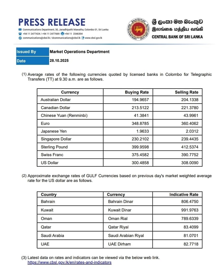 இலங்கை மத்திய வங்கியின் கூற்றுப்படி, அமெரிக்க டொலரின் கொள்முதல் மற்றும் விற்பனை விலையானது இன்று முறையே 300.48 ரூபாவாகவும், 308.00 ரூபாவாகவும் உள்ளது.