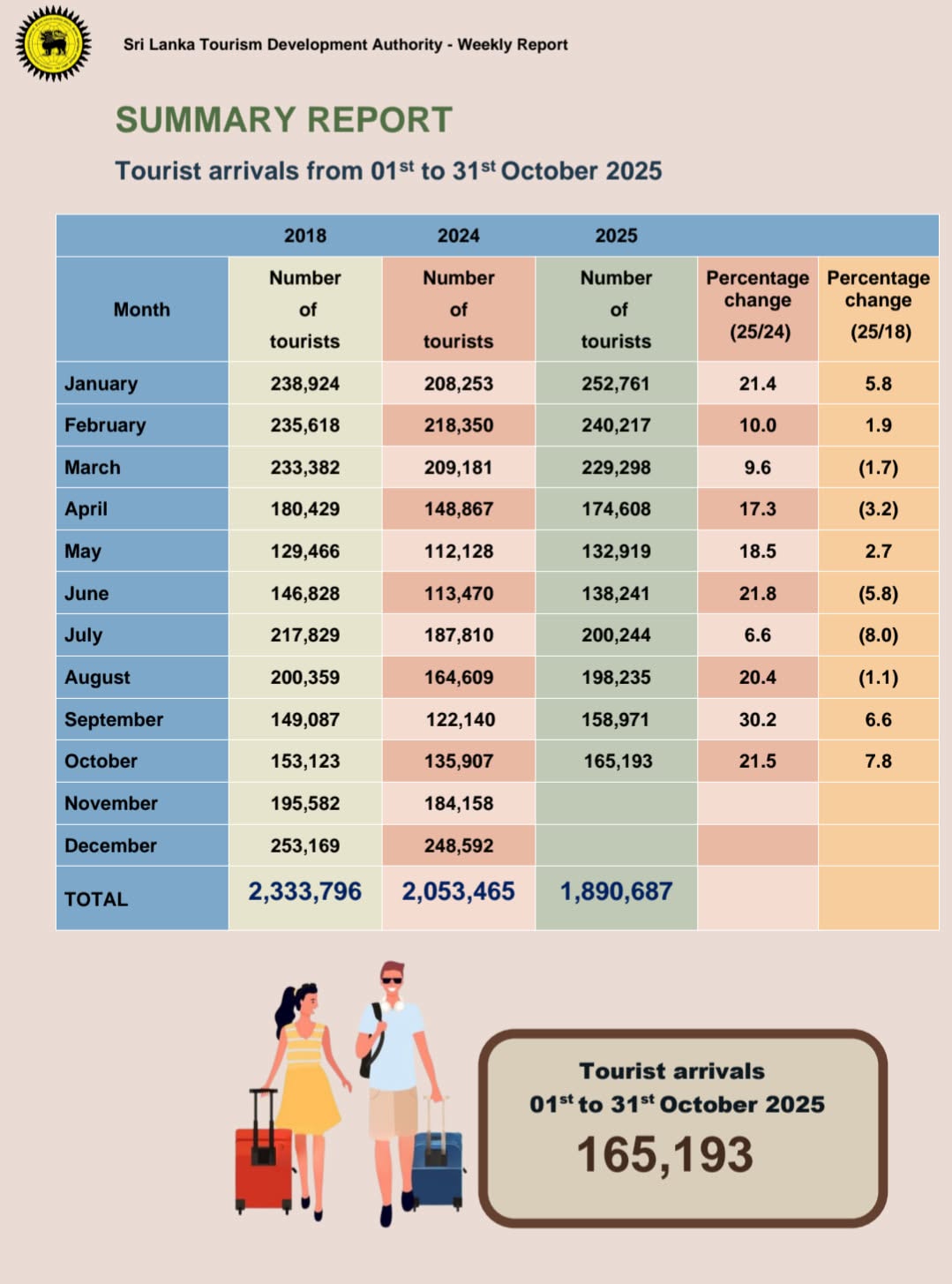 2025 ஒக்டோபரில் இலங்கை 165,193 சுற்றுலாப் பயணிகளை வரவேற்றது.