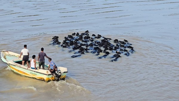 வெள்ளத்தின் கடும் நீரோட்டத்துக்கு மத்தியில், படகுகள் மூலம் மாடுகளை, மிகுந்த பிரயத்தனத்துடன் ஆற்றின் கரையோரத்திற்குக் கொண்டு சேர்த்தனர்.