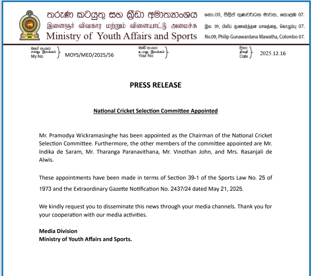 1973 ஆம் ஆண்டின் 25 ஆம் எண் விளையாட்டுச் சட்டத்தின் பிரிவு 39-1 மற்றும் 2025 மே 21, திகதியிட்ட 2437/24 ஆம் எண் கொண்ட அசாதாரண வர்த்தமானி அறிவிப்பு ஆகியவற்றின் அடிப்படையில் இந்த நியமனங்கள் செய்யப்பட்டுள்ளன என்று அந்த அறிக்கையில் தெரிவிக்கப்பட்டுள்ளது.