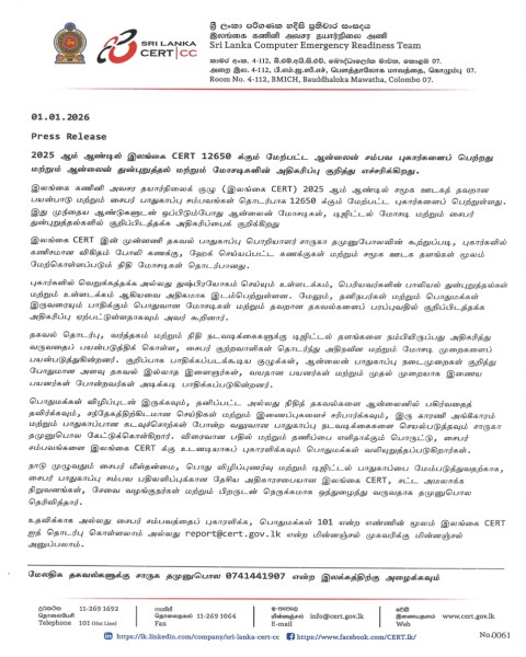 2025 ஆம் ஆண்டில் சமூக ஊடக துஷ்பிரயோகம் மற்றும் சைபர் பாதுகாப்பு சம்பவங்கள் தொடர்பாக 12,650 க்கும் மேற்பட்ட முறைப்பாடுகள் பதிவு செய்யப்பட்டுள்ளதாக இலங்கை கணினி அவசர தயார்நிலைக் குழு தெரிவித்துள்ளது.