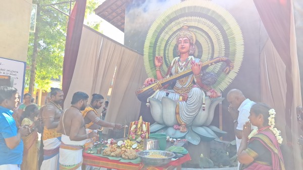 அதிதிகள் மலர் மாலை அணிவித்து, பாண்டு வாத்திய இசையுடன் வரவேற்கப்பட்டு, 12 அடி சரஸ்வதி சிலை அதிதிகளால் திரை நீக்கம் செய்யப்பட்டது.