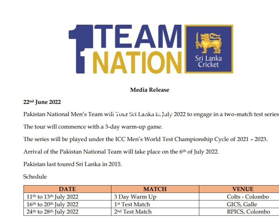 இலங்கைக்கான சுற்றுப்பயணம் மேற்கொண்டு 2 டெஸ்ட் போட்டிகளில் விளையாடுவதற்காக பாகிஸ்தான் கிரிக்கட் அணி ஜூலை 6ஆம் திகதி இலங்கைக்கு வருகைத் தரவுள்ளது.