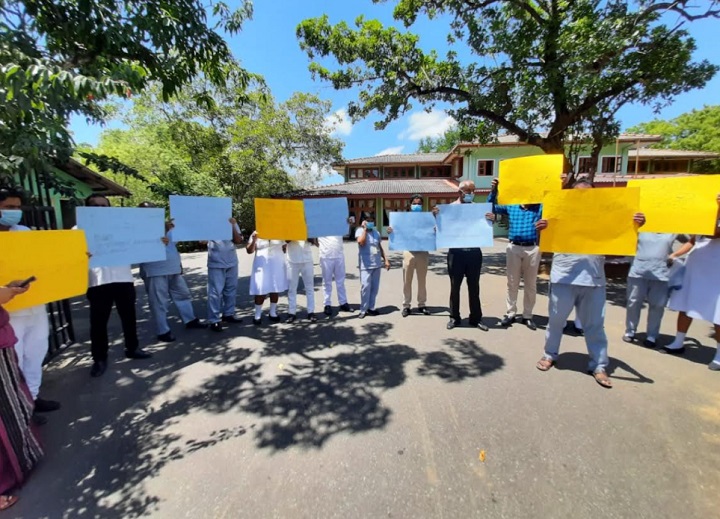 இதன்போது சுகாதார ஊழியாகள், வைத்தியசாலைக்கு முன்பாக தமது கோரிக்கைகள் அடங்கிய பதாகைகளை ஏந்தி, கவனயீர்ப்பு போராட்டத்தில் ஈடுபட்டனர்.