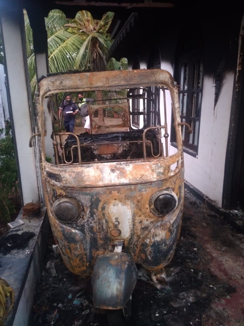 இந்த நிலையில் அதிகாலை 4 மணியளவில் சத்தம் கேட்டு வீட்டின் கதவைதிறந்து வெளியேவந்தபோது நிறுத்திவைக்கப்பட்டிருந்த முச்சக்கரவண்டி தீயில் எரிந்து கொண்டிருந்ததையடுத்து தண்ணீரை ஊற்றி தீயை கட்டுப்பாட்டிற்கு கொண்டுவந்ததாகவும் இருந்தபோதும் முச்சக்கரவண்டி முற்றாக எரிந்து செதமடைந்துள்ளதுடன் வீட்டின் முன்பகுதி யன்னல் கண்ணாடிகள் உடைந்து சேதமடைந்துள்ளதாக பொலிஸாரின் ஆரம்பகட்ட விசாரணையில் தெரியவந்துள்ளது.
