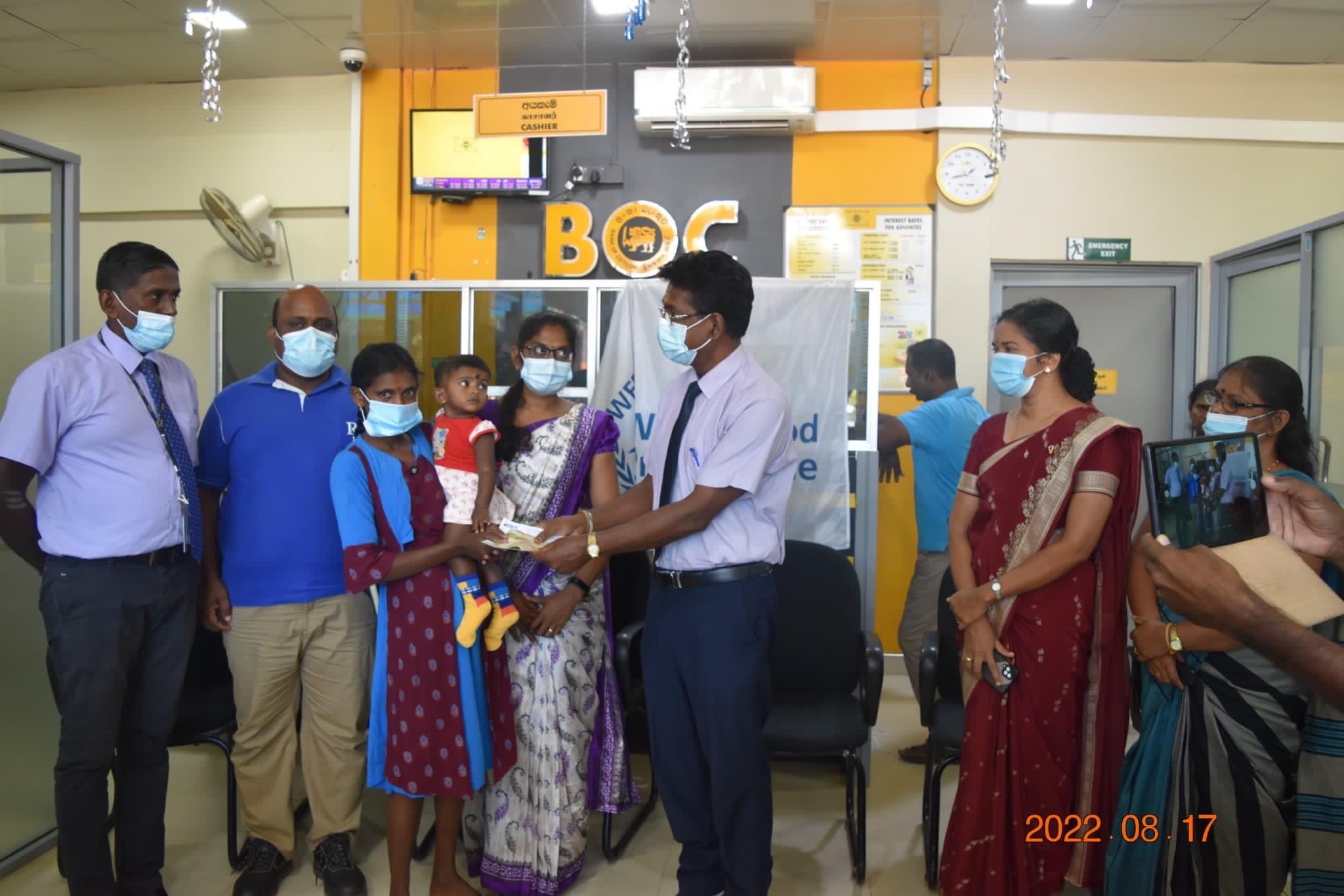 அதனடிப்படையில் ஆகஸ்ட் மாதத்திலிருந்து முல்லைத்தீவு, காலி, நுவரெலியா ஆகிய மாவட்டங்களில் இனங்காணப்பட்ட உணவுப்பாதுகாப்பற்ற மக்களுக்கு பண உதவியினை வழங்குத் திட்டத்தினை முதல்முதலாக நடைமுறைப்படுத்த உத்தேசித்துள்ளது.